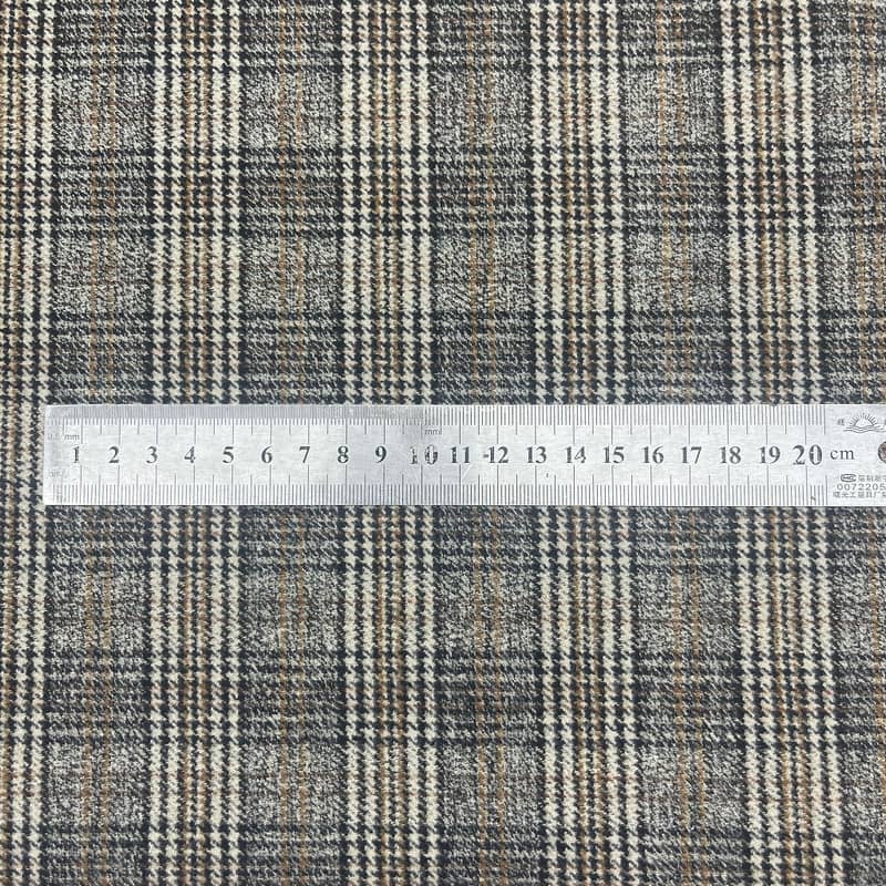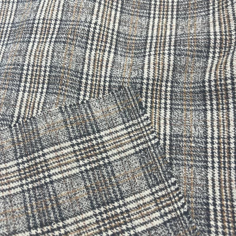 Dieser Stoff mit der Bezeichnung Artikel 250515 ist ein gewebter Stoff, der aus 20 % Wolle, 75 % Polyester und 5 % Elasthan besteht. Mit einer Masse pro Flächeneinheit von 450 g/m stellt es eine mittelschwere Konstruktion dar, die für Anzüge geeignet ist. Der Stoff weist ein integriertes Karo- und Hahnentrittmuster in Braun auf und enthält Metallgarnelemente für einen visuellen Kontrast. Der Einschluss von Elasthan sorgt für eine horizontale Dehnbarkeit von ca. 20–25 %, während die Mischung aus Wolle und Polyester für strukturelle Stabilität sorgt. Durch diese Kombination aus Faserzusammensetzung und Webtechnik entsteht ein Stoff mit definierter Elastizität und Musterdefinition, der sich für moderne, maßgeschneiderte Kleidungsstücke eignet, die sowohl Bewegungsfreiheit als auch ästhetische Details erfordern.