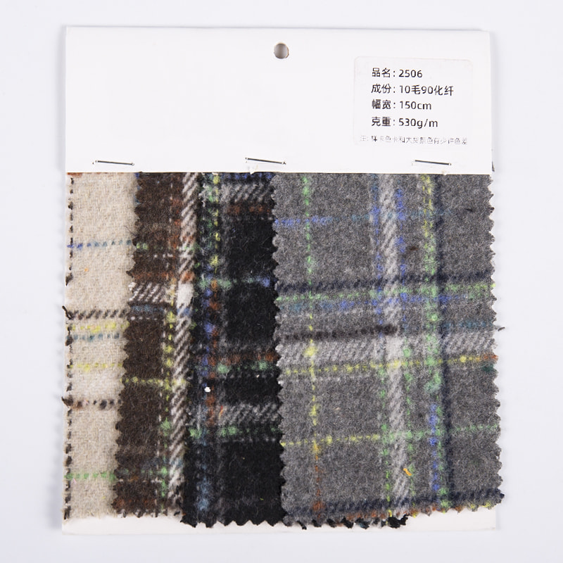Plaid-Stoff aus Bürstenfensterwolle aus Chemiefaser für Kleidung 2506 kombiniert geschickt 10 % hochwertige Wolle und 90 % hochwertige Chemiefasern. Es behält nicht nur die natürliche Wärme und Atmungsaktivität von Wolle bei, sondern bringt auch die Vorteile der Verschleißfestigkeit, der Pflegeleichtigkeit und der leuchtenden Farben der Chemiefaser zum Vorschein und beschert Ihnen ein beispielloses Trageerlebnis. Sein einzigartiger Bürstprozess bildet eine Schicht zarter und weicher Flusen auf der Oberfläche des Stoffes, die sich sanft anfühlt, als würde man im zeitigen Frühling sanft eine Wollwiese streicheln und den Menschen ein warmes und angenehmes Gefühl geben. Diese Flauschschicht verbessert nicht nur die Wärmespeicherung des Stoffes, sondern verleiht ihm auch einen einzigartigen visuellen Effekt, der dem Stoff einen bezaubernden Glanz und eine Schichtung unter dem Licht verleiht. Das Design des Karomusters ist ein weiteres Highlight dieses Stoffes. Besonderes Augenmerk legen wir auch auf die Praktikabilität und Haltbarkeit des Stoffes. Der Chemiefaseranteil von 90 % verleiht diesem Stoff eine gute Knitterfestigkeit und Verschleißfestigkeit. Auch nach mehrmaligem Waschen und Tragen bleibt es flach und neu und lässt sich nicht leicht verformen oder verblassen. Durch den Zusatz von Wolle verfügt der Stoff über eine gute Feuchtigkeitsaufnahme und Schweißleistung und hält gleichzeitig warm, so dass Ihre Haut trocken und angenehm bleibt und gleichzeitig die Wärme genießt.
