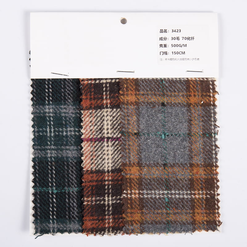 Klassischer karierter Woll-Tweed-Stoff für Kleidung im Winter 3423 übernimmt das klassische Karomuster-Design. Dieses Element hat eine lange Geschichte in der Modebranche und hat sich stets seinen einzigartigen Charme und Status bewahrt. Durch die feine Webtechnik wird das Karomuster lebendig auf dem Stoff dargestellt, was nicht nur den Retro-Charme traditioneller Kleidung beibehält, sondern auch die Einfachheit und Mode modernen Designs vereint und den Stoff optisch gut erkennbar und attraktiv macht. Beim Material wählen 3423 Stoffe 30 % hochwertige Wolle als Hauptmaterial aus. Als natürliches Wärmeisolationsmaterial weist Wolle eine gute Hygroskopizität und Atmungsaktivität auf, die die Körpertemperatur effektiv speichern und dem Träger dauerhafte Wärme und Komfort bieten kann. Gleichzeitig verbessert der weiche Griff der Wolle auch die Hautfreundlichkeit und das Tragegefühl des Stoffes deutlich. Um die Praktikabilität und Haltbarkeit des Gewebes noch weiter zu verbessern, werden dem 3423-Gewebe 70 % hochwertige Chemiefaserkomponenten hinzugefügt. Chemiefasermaterialien sind für ihre ausgezeichnete Knitter- und Verschleißfestigkeit bekannt, die dafür sorgen kann, dass der Stoff auch bei längerem Gebrauch flach und knackig bleibt und nicht anfällig für Verformungen oder Abnutzung ist. Darüber hinaus machen die pflegeleichten Eigenschaften von Chemiefasermaterialien das Gewebe auch pflegeleichter und für verschiedene Waschmethoden geeignet, was die Lebensdauer der Kleidung erheblich verlängert.