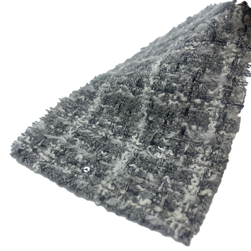 Bei diesem Stoff mit der Bezeichnung Artikel 23503 handelt es sich um ein Tweed-Textil, das aus 49 % Acryl, 40 % Polyester, 7 % Wolle und 4 % Nylon besteht. Mit einem Flächengewicht von 335 g/m² weist es eine leichte und dennoch strukturierte Konstruktion auf. Die Oberfläche weist ein feines graues Karomuster auf, das durch einen Prägeprozess erzielt wird, der eine subtile erhabene Textur auf dem Stoff erzeugt. Diese Technik verstärkt die optische Tiefe des Plaids, ohne die gewebte Basis zu verändern. Die Mehrfasermischung vereint die Stabilität von Polyester, die Widerstandsfähigkeit von Acryl, den natürlichen Griff von Wolle und die Haltbarkeit von Nylon. Aufgrund dieser Eigenschaften eignet sich der Stoff für Damenbekleidung, bei der detaillierte Muster und haptische Reize erforderlich sind.