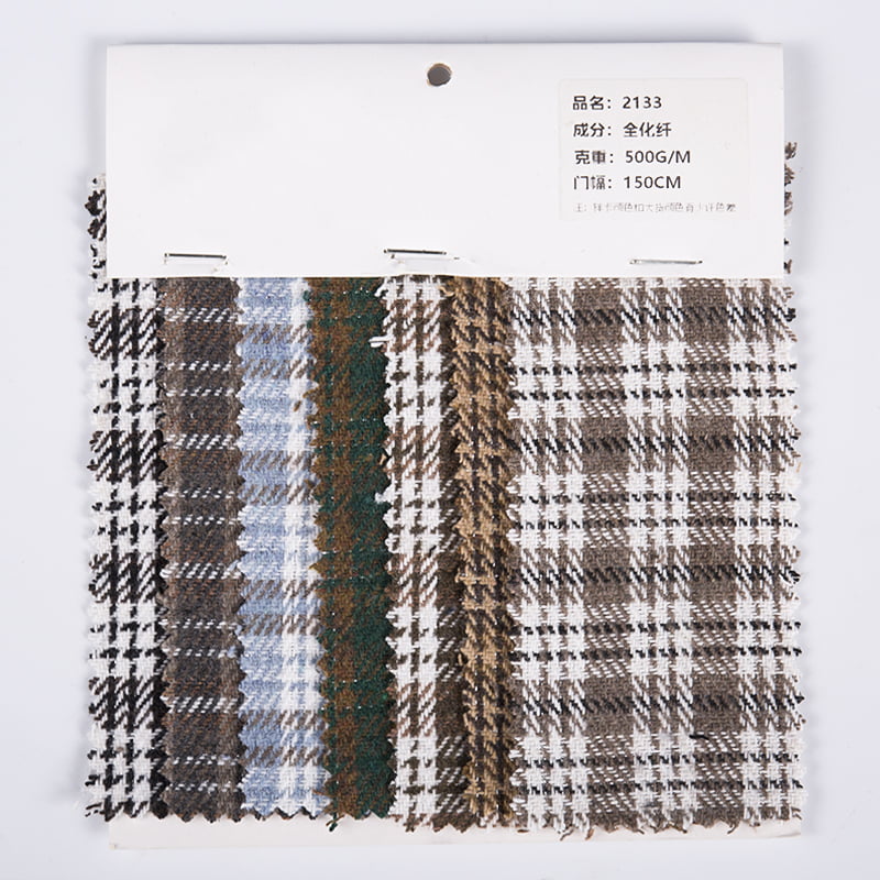 Metallic-Karo-Mehrfarben-Plaid-Chemiefaser-Tweed-Stoff für Mäntel 2133 ist ein exquisites Kleidungsstück, das modisches Design mit hochwertigen Materialien kombiniert. Der Mantel besteht zu 100 % aus Chemiefasergewebe und wurde speziell verarbeitet, um hervorragende physikalische Eigenschaften und ein angenehmes Tragegefühl zu gewährleisten. Das Chemiefasermaterial verleiht der Kleidung nicht nur eine gute Knitterfestigkeit, Verschleißfestigkeit und pflegeleichte Eigenschaften, sondern macht den Mantel auch leicht und verfügt über eine hervorragende Wärmespeicherung und Atmungsaktivität, sodass er für die Tragebedürfnisse unter verschiedenen Klimabedingungen geeignet ist. Was das Stoffdesign angeht, weist der Mantel ein einzigartiges Metallgittermuster auf und durch präzise Webtechnik werden verschiedene Farben geschickt integriert, um einen modernen und Retro-Optikeffekt zu erzielen. Die Auswahl und Abstimmung dieser Farben verstärkt nicht nur den modischen Sinn des Mantels, sondern macht ihn auch optisch mehrschichtig und dreidimensionaler und erfüllt so die ästhetischen Bedürfnisse verschiedener Verbraucher. Gleichzeitig verleiht die Textur des Tweeds dem Mantel eine einzigartige Textur, und der feine Webprozess sorgt dafür, dass die Oberfläche des Stoffes eine zarte Textur aufweist, die die Gesamtqualität verbessert.