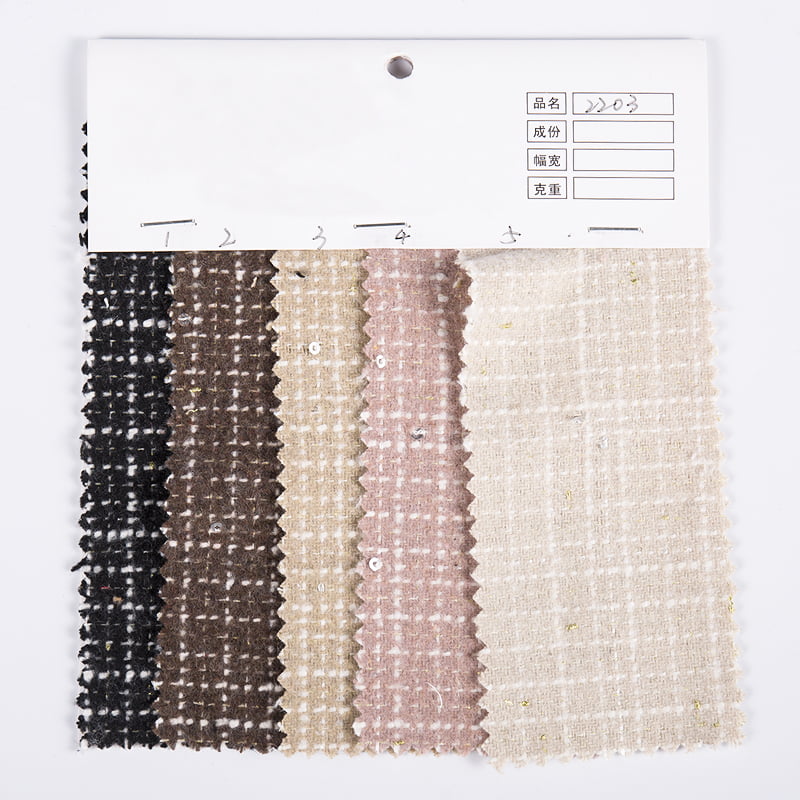 Der karierte Tweed-Stoff 2203 mit Pailletten und Karomuster ist ein Stoffprodukt aus 100 % hochwertiger Chemiefaser. Durch fortschrittliche Textiltechnologie kombiniert dieser Stoff perfekt die Haltbarkeit, Knitterfestigkeit und Pflegeleichtigkeit von Chemiefasern und stellt sicher, dass der Stoff auch nach längerem Gebrauch und häufigem Waschen seine ursprüngliche Form und Textur behält. Das Hauptmerkmal des Stoffes ist sein einzigartiges Karomuster mit Pailletten. Die Paillettenelemente werden durch ein feines Einlegeverfahren gleichmäßig auf der Stoffoberfläche verteilt, was nicht nur die visuelle Schichtung des Stoffes verstärkt, sondern auch unter dem Licht einen zarten und dezenten Glanzeffekt zeigt, der dem Stoff ein einzigartiges Highlight verleiht Kleidung. Das Karomuster übernimmt die klassische Farbabstimmung und Anordnung, die nicht nur den Retro-Charme des Tweed-Stoffs beibehält, sondern auch die Einfachheit und Atmosphäre des modernen Designs einbezieht, sodass der Stoff bei verschiedenen Anlässen ein elegantes und stilvolles Aussehen zeigen kann. Was die Textur betrifft, verleiht der mit Pailletten besetzte Tweed-Stoff 2203 mit seinem Tweed-Webverfahren dem Stoff einen satten dreidimensionalen Eindruck und eine zarte Haptik. Die Auswahl an Chemiefasern macht den Stoff weich und bequem und weist gleichzeitig eine gute Atmungsaktivität und Verschleißfestigkeit auf, sodass der Träger Komfort und Bequemlichkeit erleben und gleichzeitig die Schönheit der Mode genießen kann. Der mit Pailletten besetzte karierte Tweedstoff 2203 weist außerdem eine extrem hohe Plastizität und Anwendbarkeit auf. Ganz gleich, ob er für hochwertige, maßgeschneiderte Mode oder Accessoires für den täglichen Gebrauch verwendet wird, der Stoff kann verschiedene Designstile und Schneideranforderungen perfekt integrieren und zeigt unterschiedliche modische Reize.