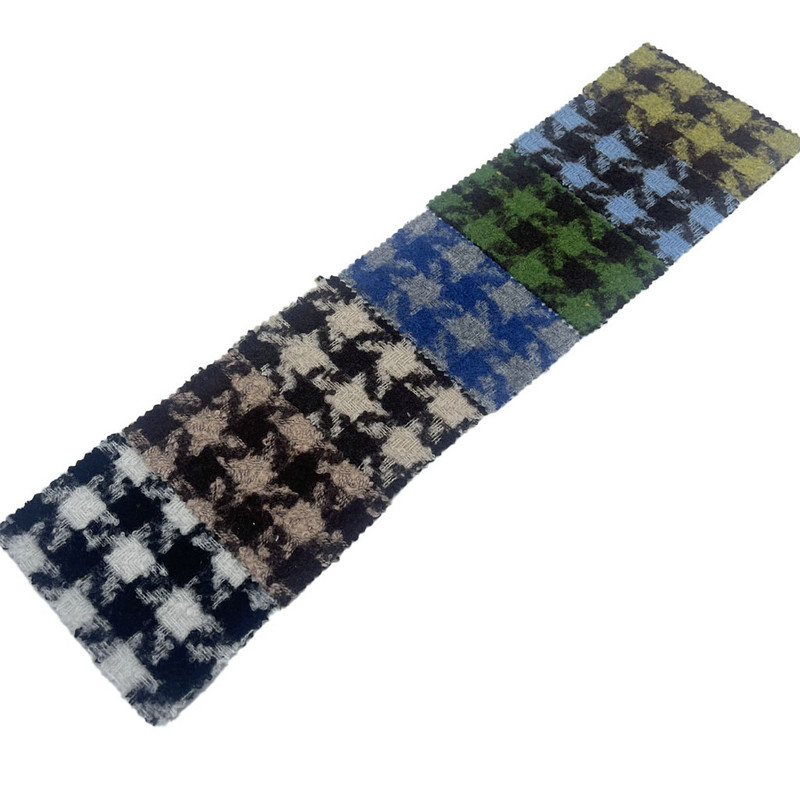Bei diesem Stoff mit der Bezeichnung Artikel 2882 handelt es sich um einen Jacquard-Tweed-Textil, der zu 10 % aus Wolle und zu 90 % aus anderen Fasern besteht. Mit einem Flächengewicht von 600 g/m handelt es sich um eine schwere Konstruktion. Die Oberfläche kombiniert durch das Jacquard-Webverfahren ein Hahnentrittmuster mit karierten Elementen. Durch das Auftragen einer Bürstenoberfläche entsteht eine erhabene, teddyartige Textur, die eine dichte, kurzflorige Oberfläche bildet. Diese Technik verändert sowohl die visuelle Tiefe als auch die taktilen Eigenschaften des Stoffes und behält gleichzeitig die geometrische Präzision der gewebten Muster bei. Die Zusammensetzung der Wollmischung trägt zur Widerstandsfähigkeit und Wärmeisolierung des Materials bei. Aufgrund dieser technischen Eigenschaften eignet sich dieser Stoff für Projekte, die sowohl eine komplexe Musterdefinition als auch eine ausgeprägte Oberflächenstruktur erfordern.